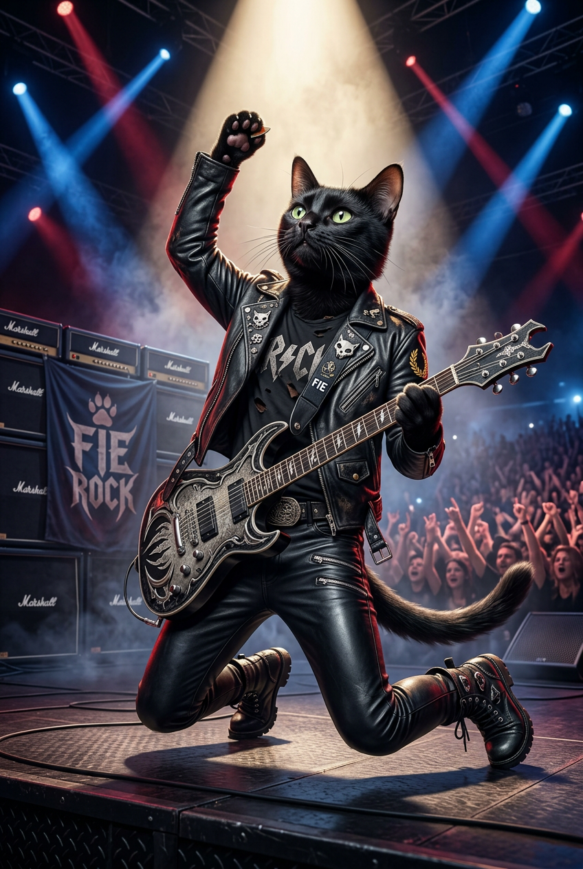 Anthropomorphic black cat in elegant rock concert stage outfit with leather jacket and boots, performing on stage with dramatic lighting and spotlights, rockstar musician pose