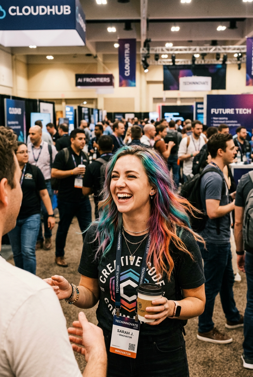 woman with vibrant colorful hair at tech conference, candid moment laughing, busy event background with people and booths, natural lighting, energetic documentary style photography, creative personality