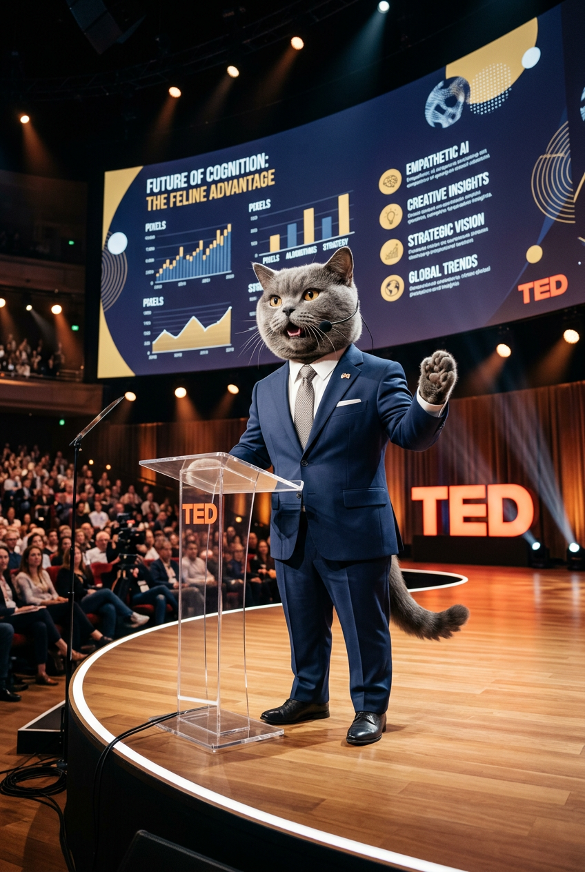 An anthropomorphic British Shorthair cat wearing a sharp navy power suit and crisp white dress shirt, standing confidently on a TED talk stage. The cat is mid-speech with one paw raised expressively. Behind the cat is a large LED screen displaying data visualization and insights. Professional stage lighting, modern auditorium setting, thought leader energy, influential speaker, polished and charismatic appearance. Studio photography lighting, sharp focus.
