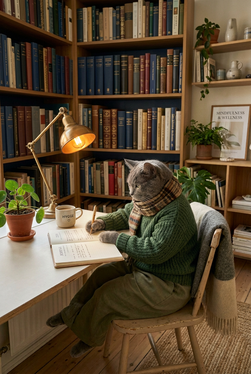 Anthropomorphic gray cat in cozy winter clothing (sweater and scarf) in a library surrounded by bookshelves, reading by warm lamplight, peaceful studious atmosphere, soft warm colors
