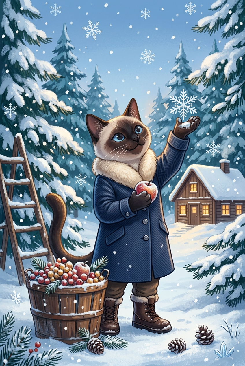 Siamese cat anthropomorphic character in a snowy winter wonderland, wearing elegant winter coat and snow boots, surrounded by snow-covered pine trees and falling snowflakes, cozy winter aesthetic with blue and white tones, magical holiday lighting, charming illustration style