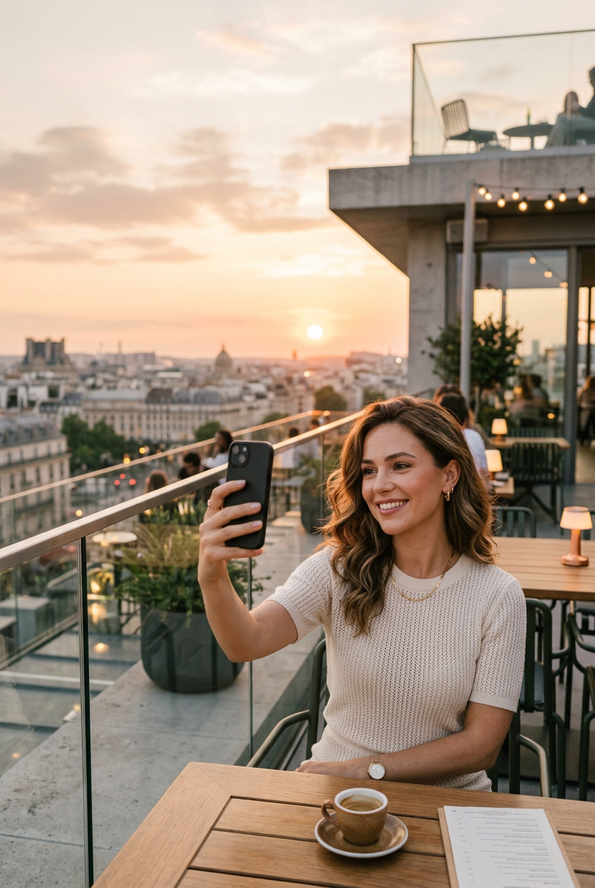 A stylish woman in her 20s taking a selfie at a rooftop cafe, golden hour lighting, soft warm sunset glow, minimalist aesthetic, clean modern design, urban setting with soft neutral tones and elegant composition