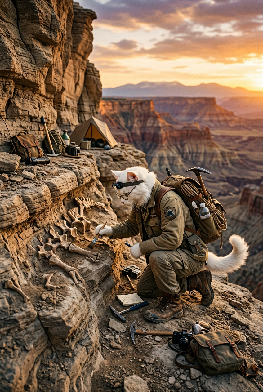 An anthropomorphic white cat in paleontologist field outfit (heavy jacket, hiking boots, backpack with fossil tools) excavating dinosaur bones from rocky cliff face, dramatic geological formations, sunset lighting, cinematic