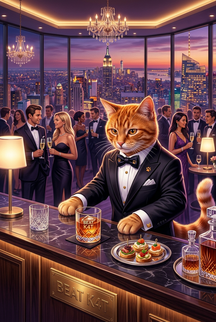 Orange cat in elegant formal tuxedo and bow tie, standing in a luxury penthouse lounge with city skyline, sophisticated atmosphere