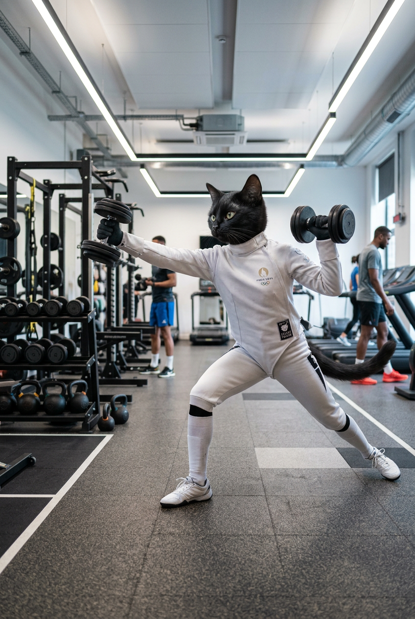 Anthropomorphic black cat fencer in athletic sportswear and training gear at a modern gym or training facility, dynamic action pose with dumbbells