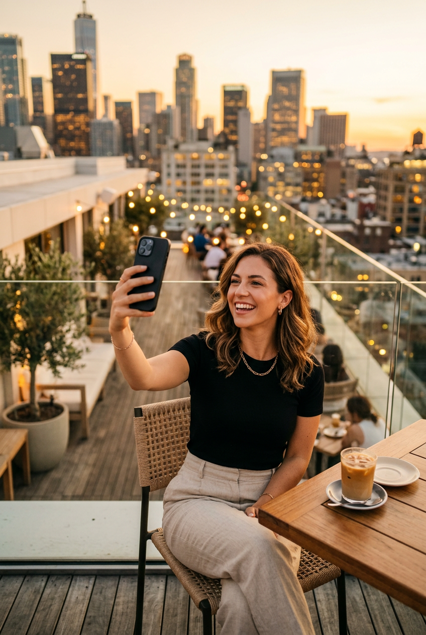 Stylish woman in her 20s taking a selfie at a rooftop cafe during golden hour, warm sunlight, minimalist aesthetic, clean modern composition, sleek fashion outfit, confident pose, city skyline blurred in background, soft bokeh lighting