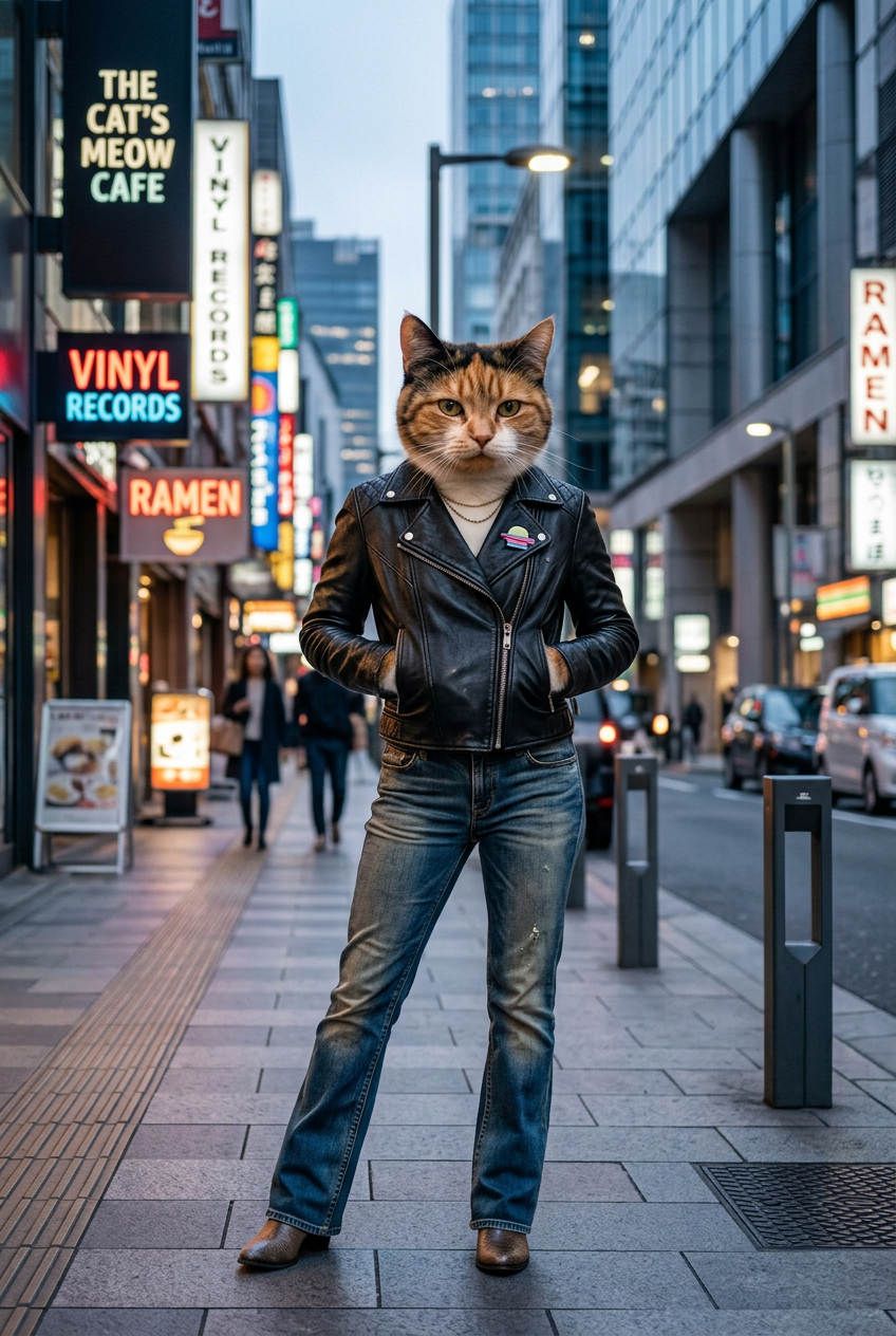 An anthropomorphic calico cat wearing a chic black leather jacket and vintage jeans, posing in a modern urban city street with neon lights and architectural details, cool evening lighting, fashion photography style