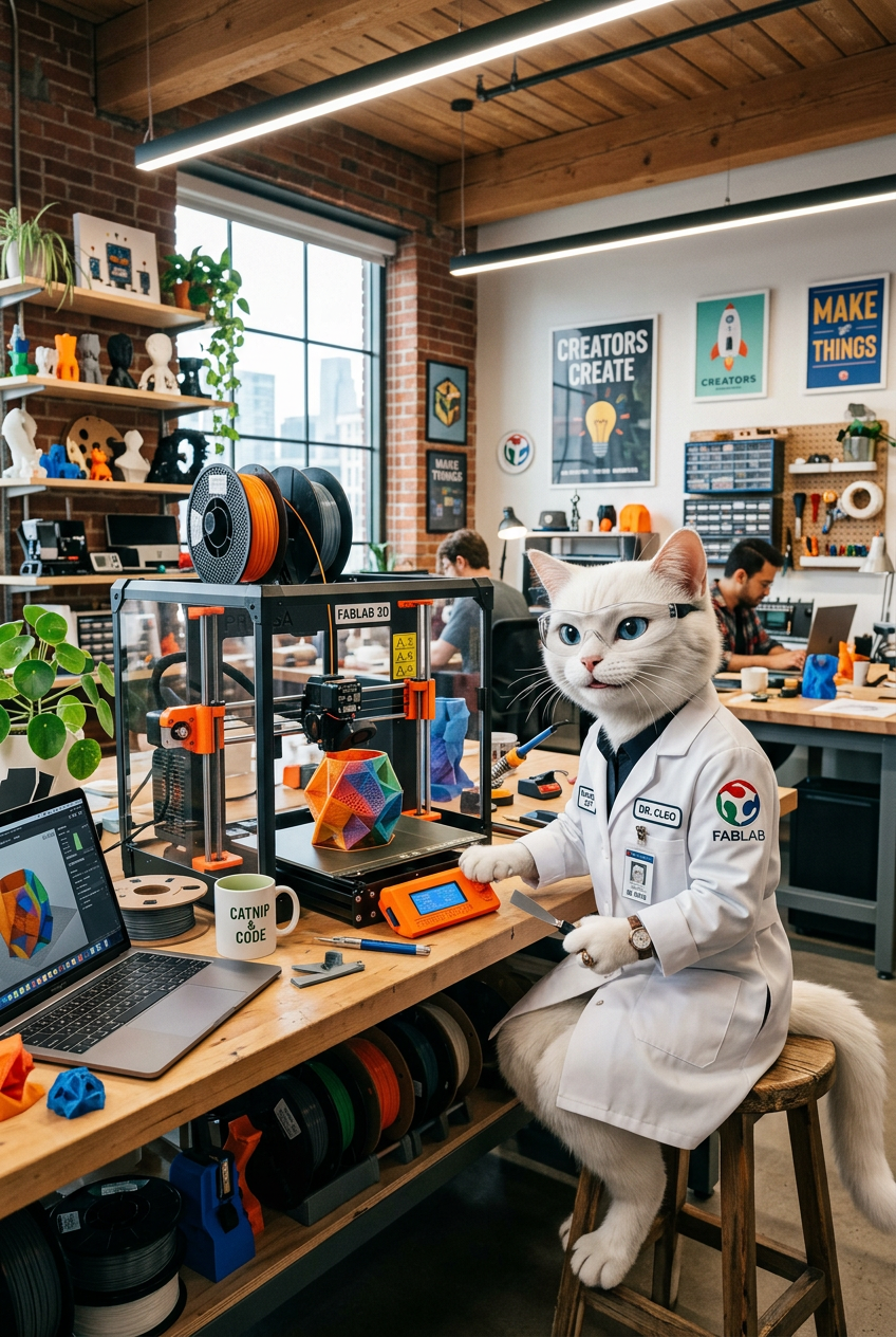 An anthropomorphic white cat wearing a lab coat, 3D printing a sculpture in a modern workshop, maker influencer aesthetic, professional lighting, contemporary design studio