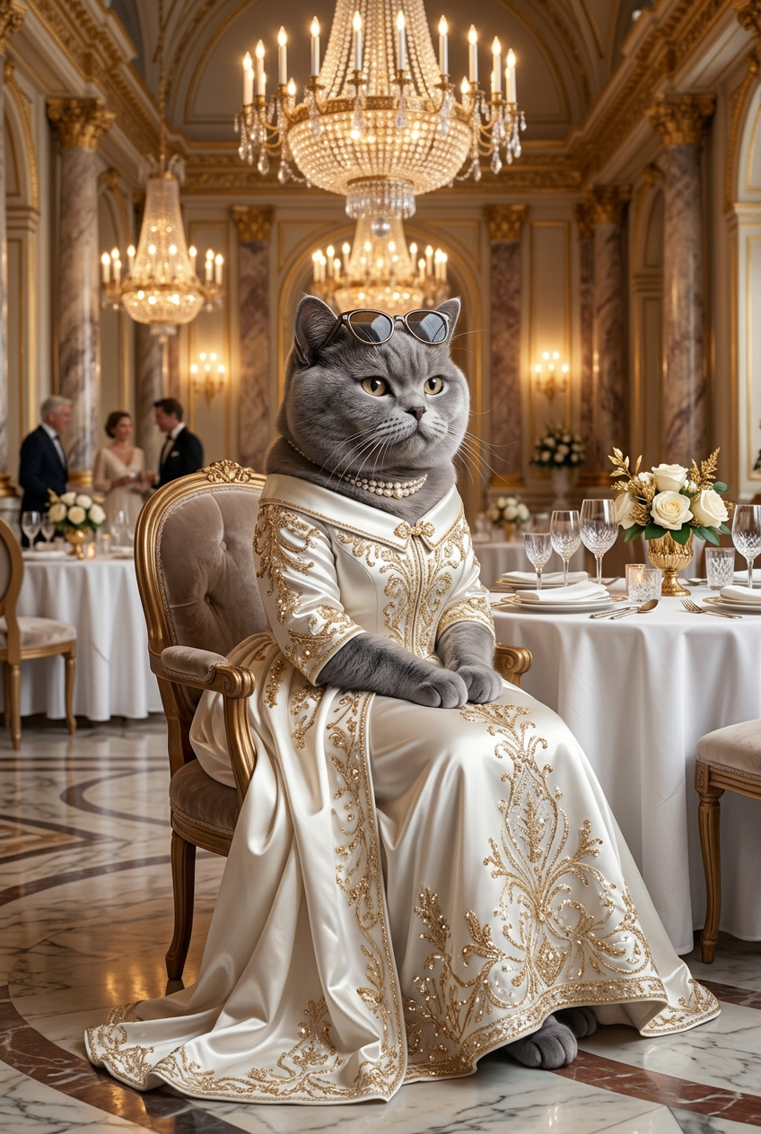 A British shorthair cat wearing an elegant white and gold evening gown, sitting gracefully in a luxurious ballroom with crystal chandeliers, marble columns, and fine dining ambiance, sophisticated and glamorous