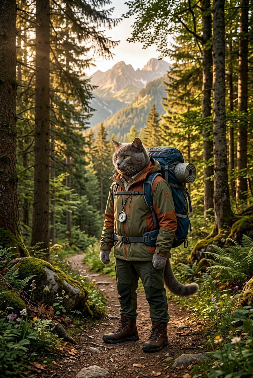 Anthropomorphic gray cat in hiking gear and outdoor outfit (jacket and backpack) on a forest trail surrounded by trees and mountains, golden sunlight through trees, adventure and nature theme
