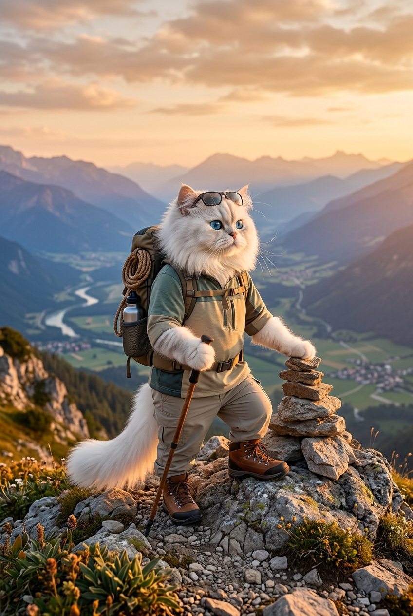 Anthropomorphic Persian cat in casual hiking gear and boots, standing on a mountain summit with scenic valley view below, adventure travel photography, golden hour lighting