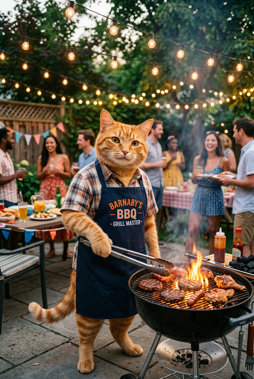 An anthropomorphic orange cat wearing a BBQ apron, holding stainless steel tongs, grilling at a backyard party. The cat is standing confidently at a grill with flames, surrounded by string lights overhead, festive summer atmosphere, cheerful and fun BBQ content, professional but playful style