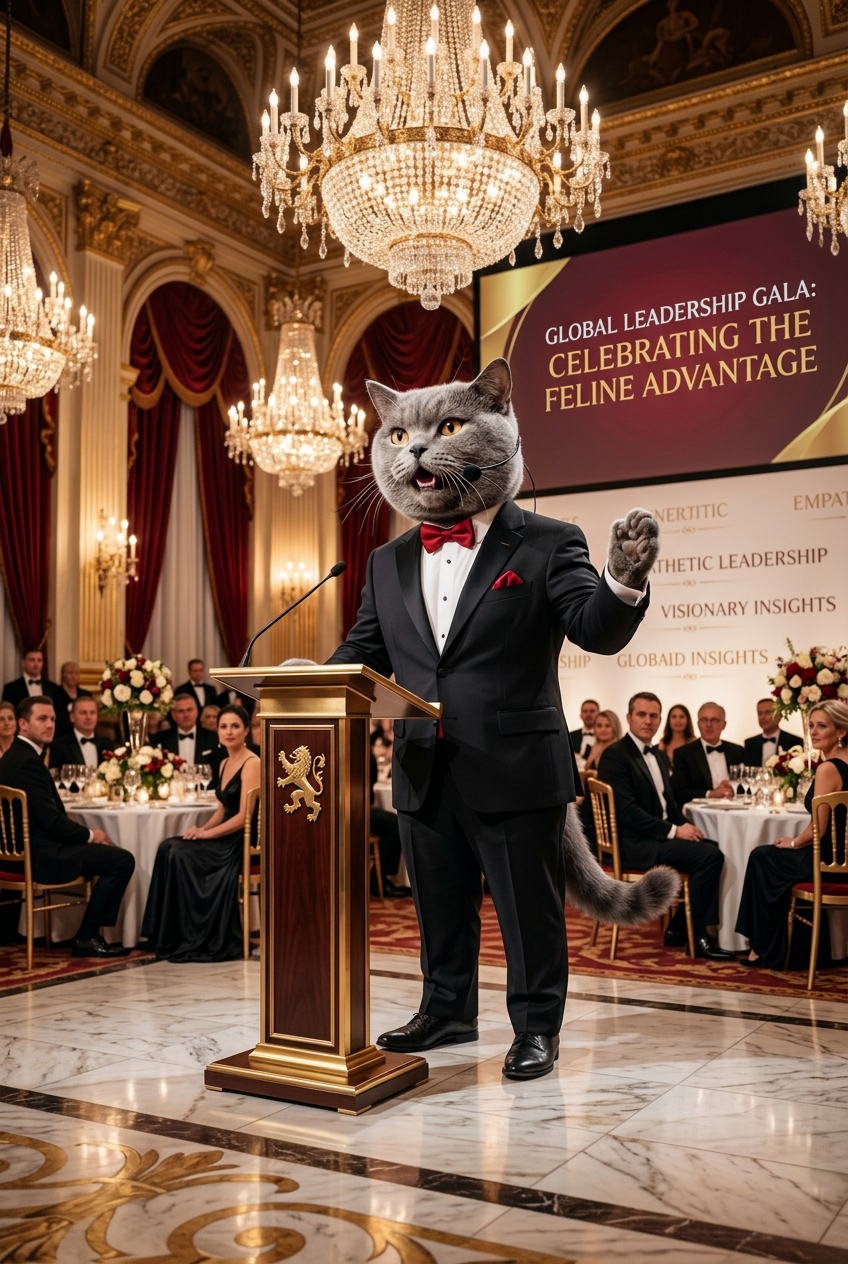 Same anthropomorphic British Shorthair cat CEO character, now dressed in an elegant black formal tuxedo with a red bow tie, at a glamorous gala event in a luxury ballroom with chandeliers, gold accents, and velvet curtains