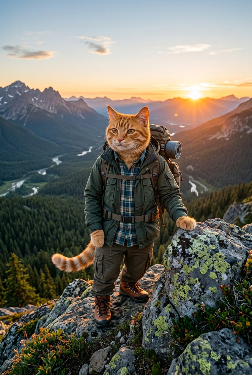 An anthropomorphic orange cat wearing a hiking outfit with backpack and boots, standing on a mountain peak at sunset with forests and valleys below, adventurous and outdoorsy, scenic mountain landscape