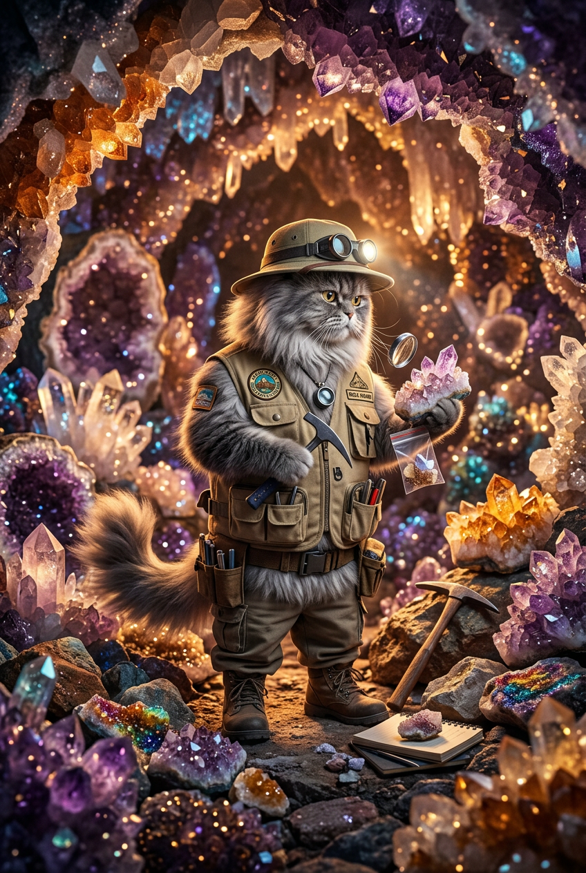 An anthropomorphic Persian cat in a geologist's outfit, examining crystals in a glittering cave. The cat stands upright wearing a khaki field vest, explorer hat, and goggles, holding a pickaxe and collection hammer. Surrounded by massive geodes, quartz formations, and colorful mineral specimens that sparkle and reflect light. The cave walls are lined with glowing amethyst, citrine, and rainbow crystals. Dramatic warm lighting illuminates the scene. Professional mineral collecting influencer aesthetic, highly detailed, cinematic.