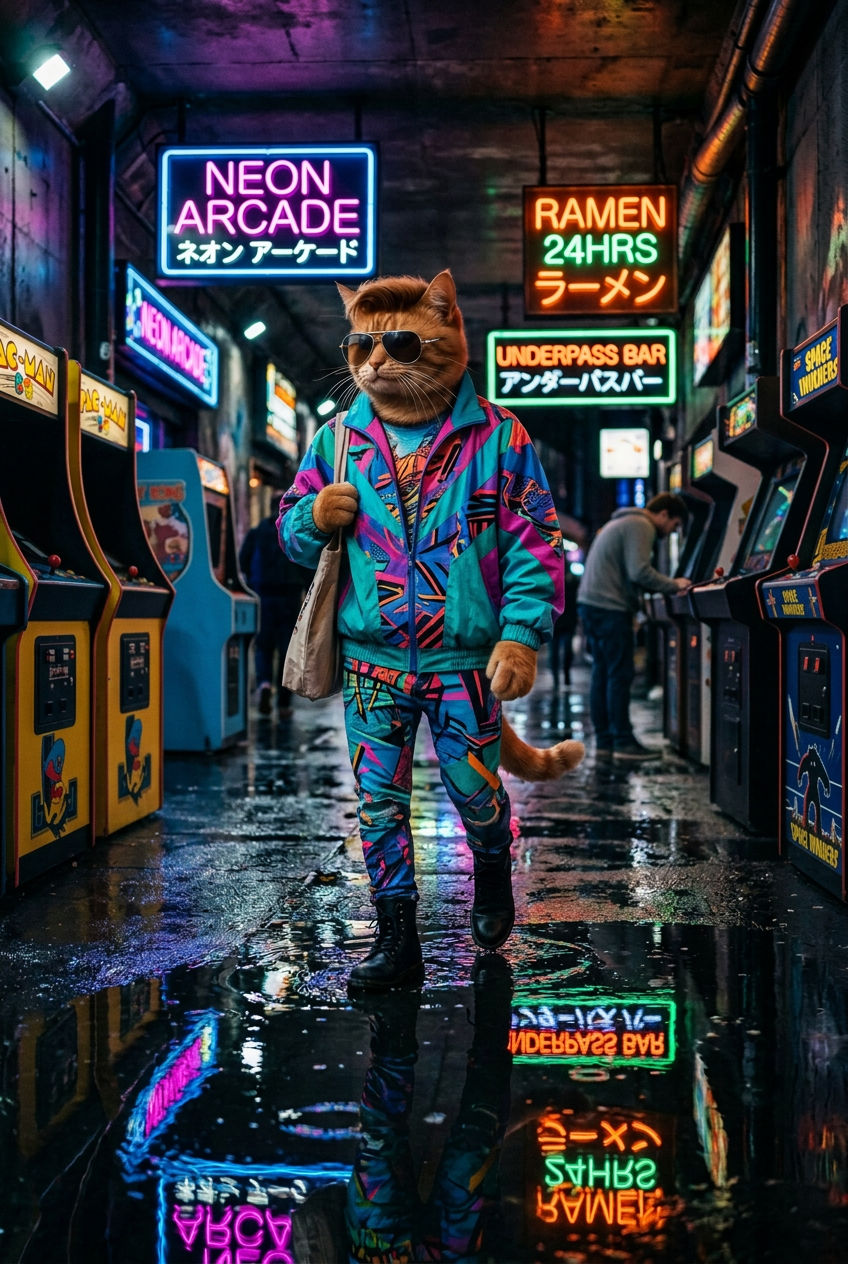 An anthropomorphic ginger cat in a vintage retro outfit with sunglasses and a colorful jacket, walking through a neon arcade with glowing arcade machines and bright neon signs