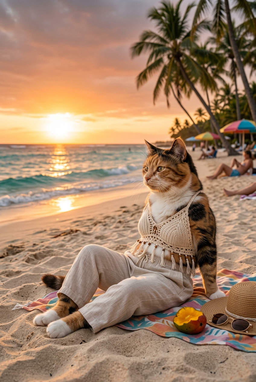 An anthropomorphic calico cat wearing a bohemian crop top and linen pants, sitting by a sandy beach with turquoise ocean waves and palm trees, warm tropical sunset lighting, vacation vibes, travel photography style