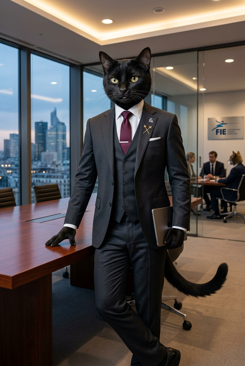 Anthropomorphic black cat fencer in professional business suit and tie at a sleek modern office or corporate setting, confident executive pose