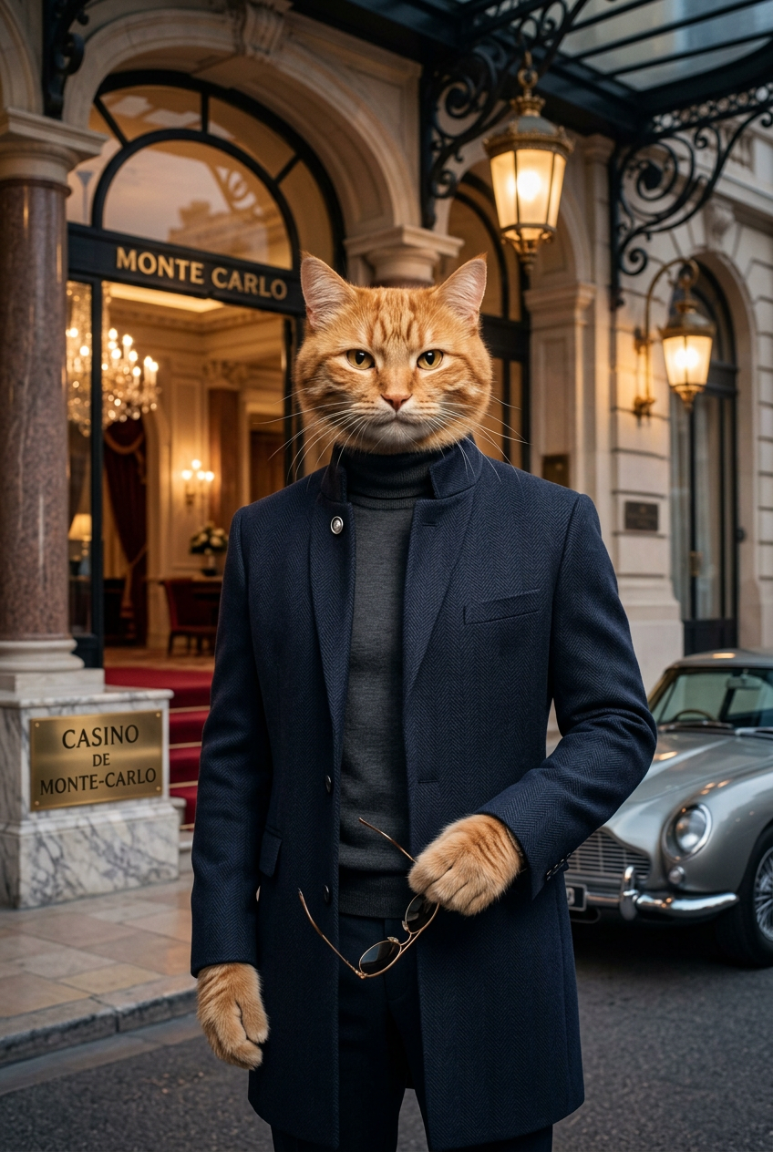 Anthropomorphic ginger cat in a sleek turtleneck and designer coat, standing at a private Monte Carlo casino entrance with elegant architecture, James Bond aesthetic, sophisticated spy vibe, professional portrait lighting