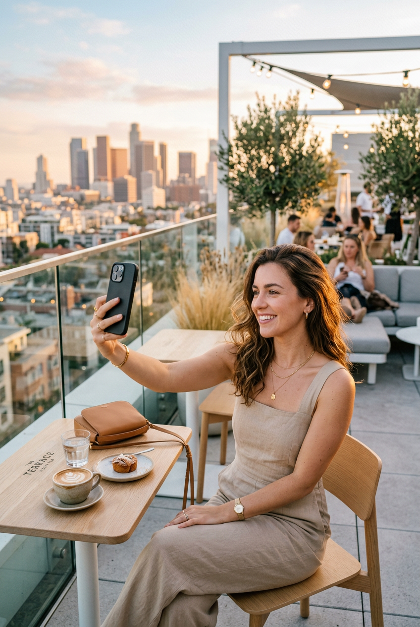 Stylish woman in her 20s taking a selfie at a rooftop cafe during golden hour, warm sunlight, minimalist aesthetic, clean modern design, soft shadows, contemporary fashion, bright and airy atmosphere