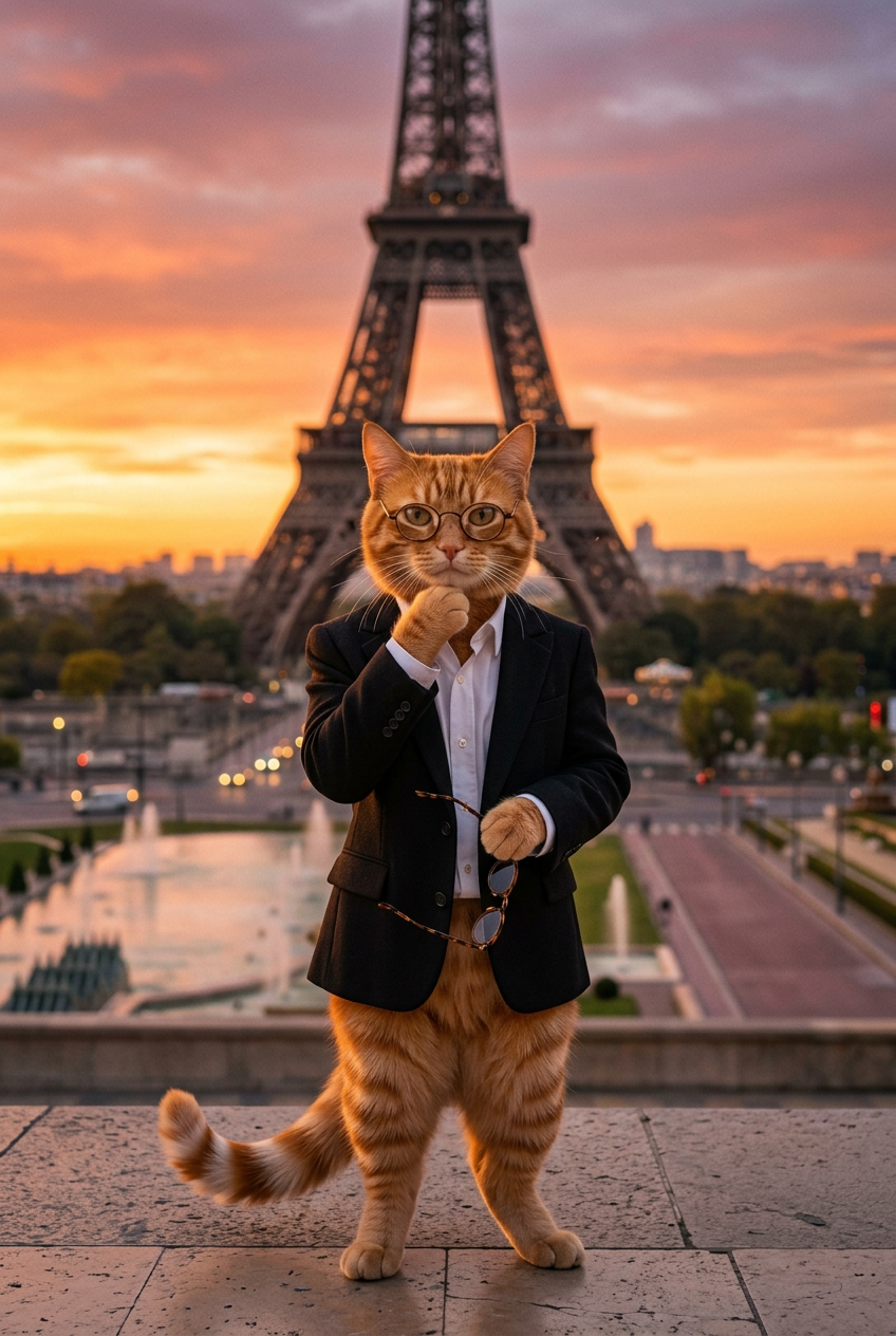 Anthropomorphic orange cat in a chic black blazer and white shirt, standing in front of the Eiffel Tower at sunset, sophisticated fashion photography style, golden hour lighting