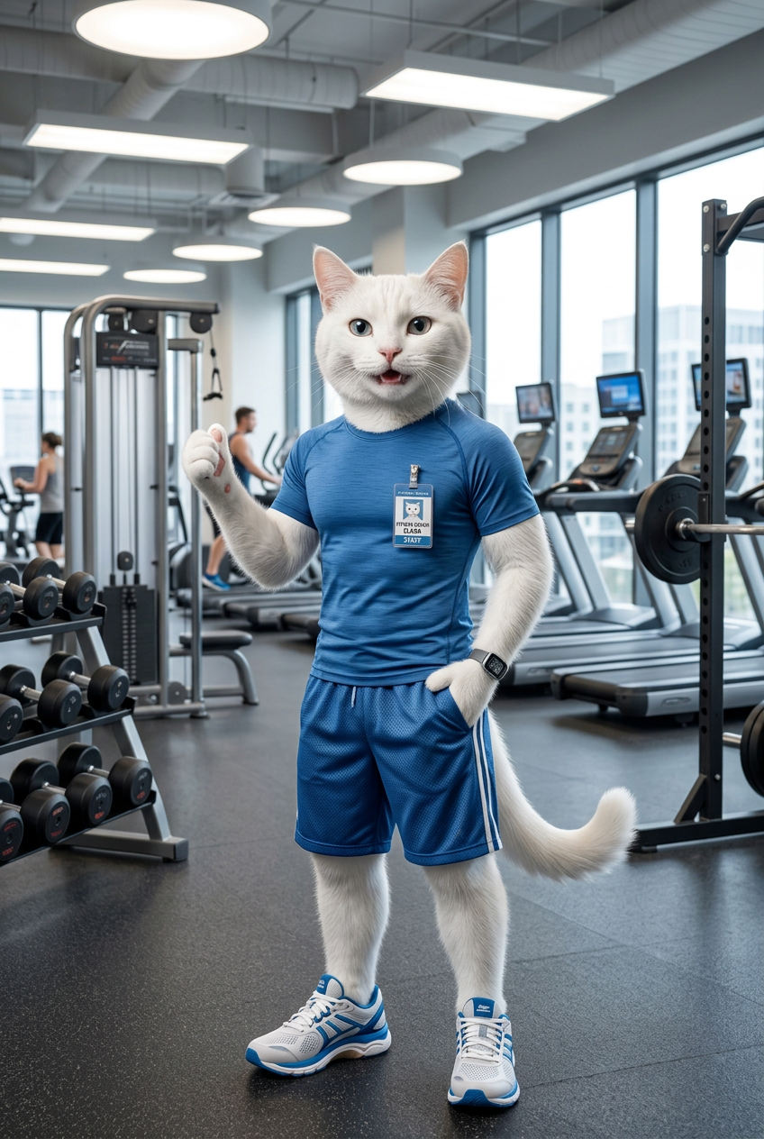 anthropomorphic white cat wearing casual gym outfit and sneakers, standing in modern fitness gym with equipment, athletic pose, energetic expression, detailed, professional lighting