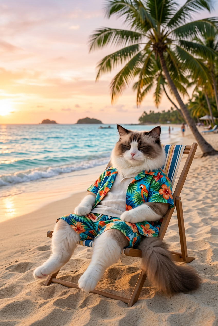 Anthropomorphic ragdoll cat in colorful summer beach outfit (tropical shirt and shorts), relaxing on a sandy tropical beach with palm trees, crystal blue ocean, sunset lighting, vacation atmosphere