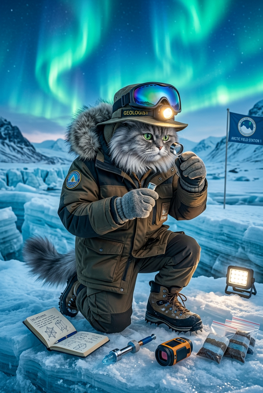 Anthropomorphic Persian cat geologist in Arctic expedition gear, wearing thick insulated parka, thermal gloves, goggles, and boots, studying ice formations and glacial samples in snowy mountain landscape with aurora borealis in sky, professional cold climate research aesthetic, icy blue lighting, cinematic quality
