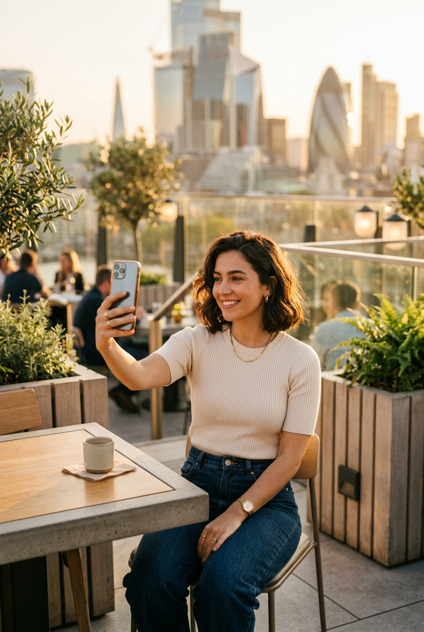 Stylish woman in her 20s taking a selfie at a rooftop cafe during golden hour, minimalist aesthetic, soft warm sunlight, modern urban setting, clean composition, contemporary fashion, confident pose