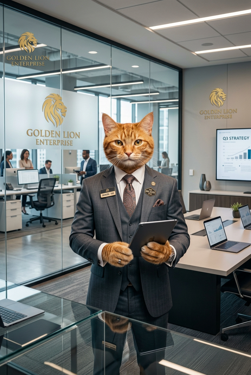 An anthropomorphic ginger cat in a high-tech corporate office, wearing a sleek grey suit and holding a tablet, standing in a modern glass-walled conference room, tech entrepreneur style, professional lighting