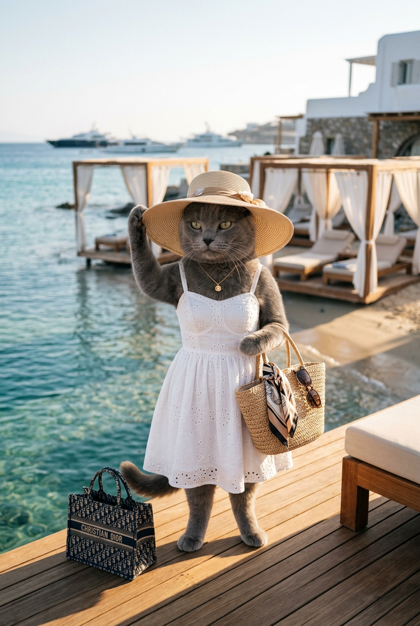 An anthropomorphic gray cat in an elegant white summer dress and sun hat at a Mediterranean beach resort, turquoise water and luxury cabanas in background, relaxed vacation aesthetic, golden hour lighting, detailed fashion photography