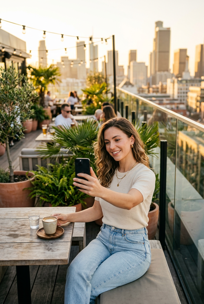 stylish woman in her 20s taking a selfie at a rooftop cafe during golden hour, warm soft sunlight, minimalist aesthetic, modern urban setting, elegant casual outfit, natural makeup, confident pose, blurred cafe background with potted plants, cinematic lighting, professional photography