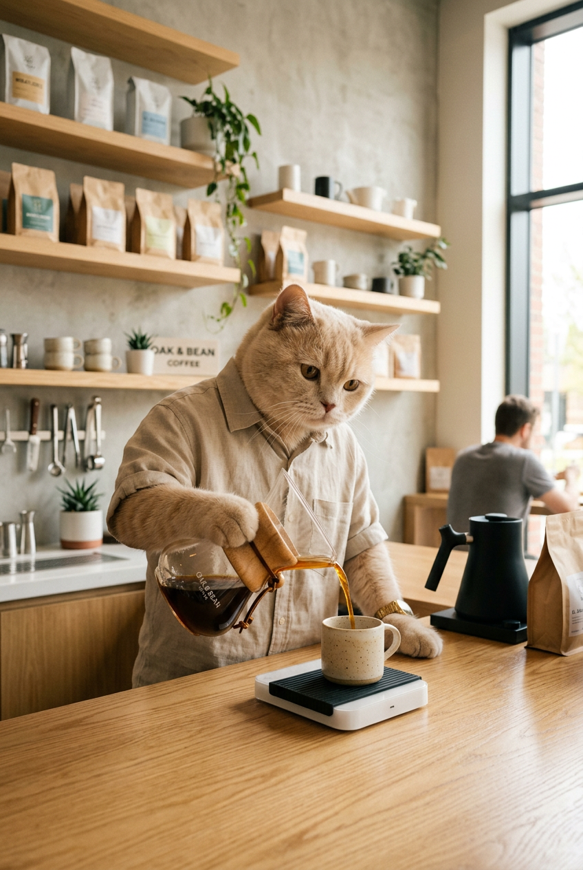 Anthropomorphic cream-colored cat in a linen shirt, pouring specialty coffee from a chemex coffee maker at a minimalist modern cafe, professional barista influencer aesthetic, warm natural lighting, minimalist interior design, high quality photography