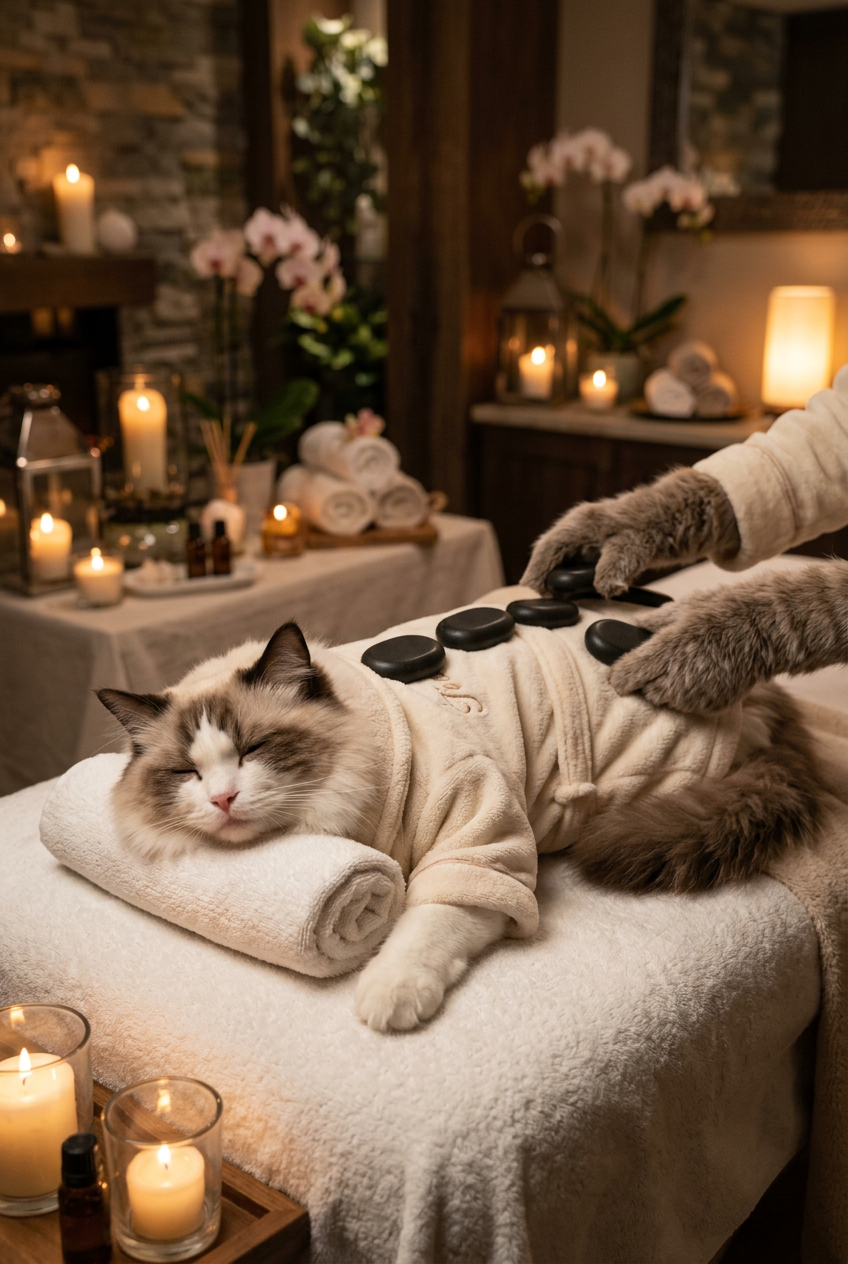 An anthropomorphic ragdoll cat in a plush robe, getting a hot stone massage at a luxury spa, self-care content creator, relaxed expression, spa setting with candles and soft lighting, high-quality lifestyle photography