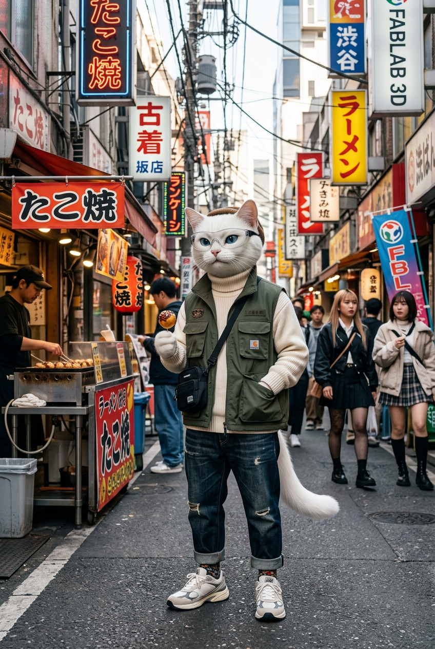 anthropomorphic white cat wearing casual street style outfit, posing in a vibrant Tokyo street market, neon signs, street food stalls, urban fashion photography, natural daylight