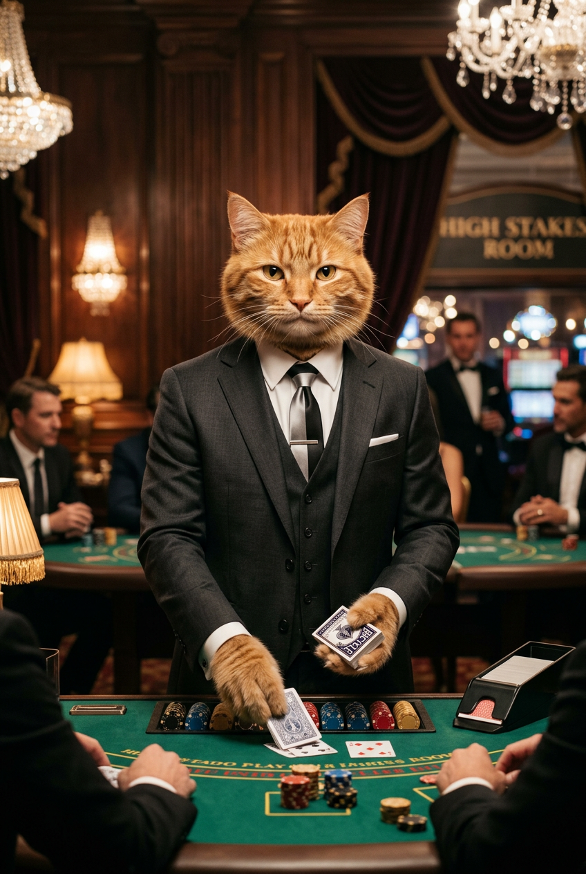 Anthropomorphic ginger cat wearing a sharp tailored suit, dealing cards at a high-stakes poker table in a luxurious casino, professional poker influencer, cinematic lighting, detailed facial expression, sophisticated atmosphere