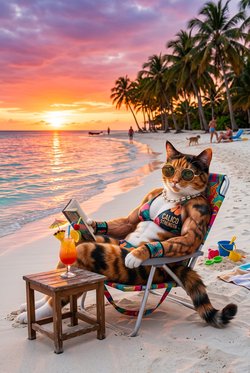 anthropomorphic calico cat in bikini and sunglasses, relaxing on a tropical beach with palm trees and ocean sunset, vibrant summer vibes