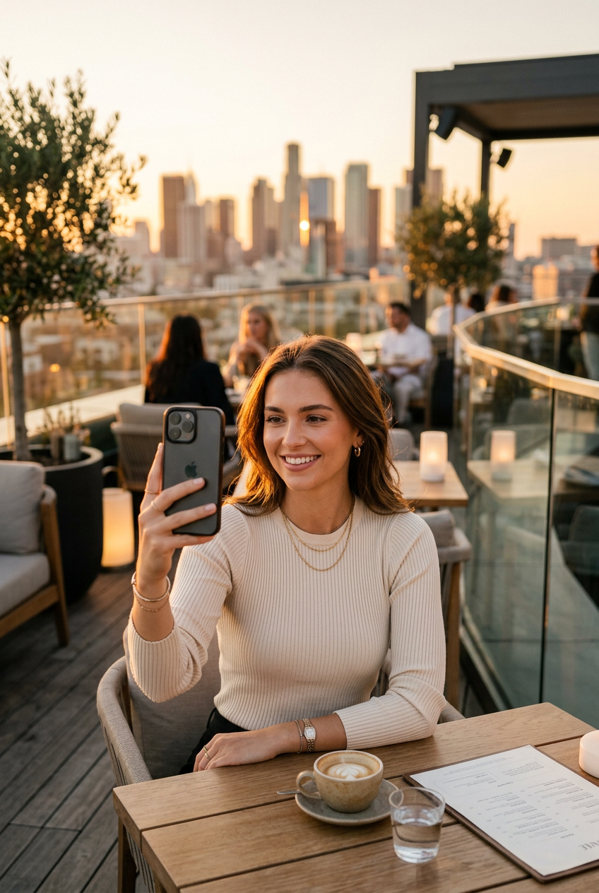 Stylish woman in her 20s taking a selfie at a rooftop cafe during golden hour. Minimalist aesthetic, warm golden sunlight, modern and elegant. She's holding a phone, smiling at camera. Clean composition, soft bokeh background with city skyline. Professional photography style.