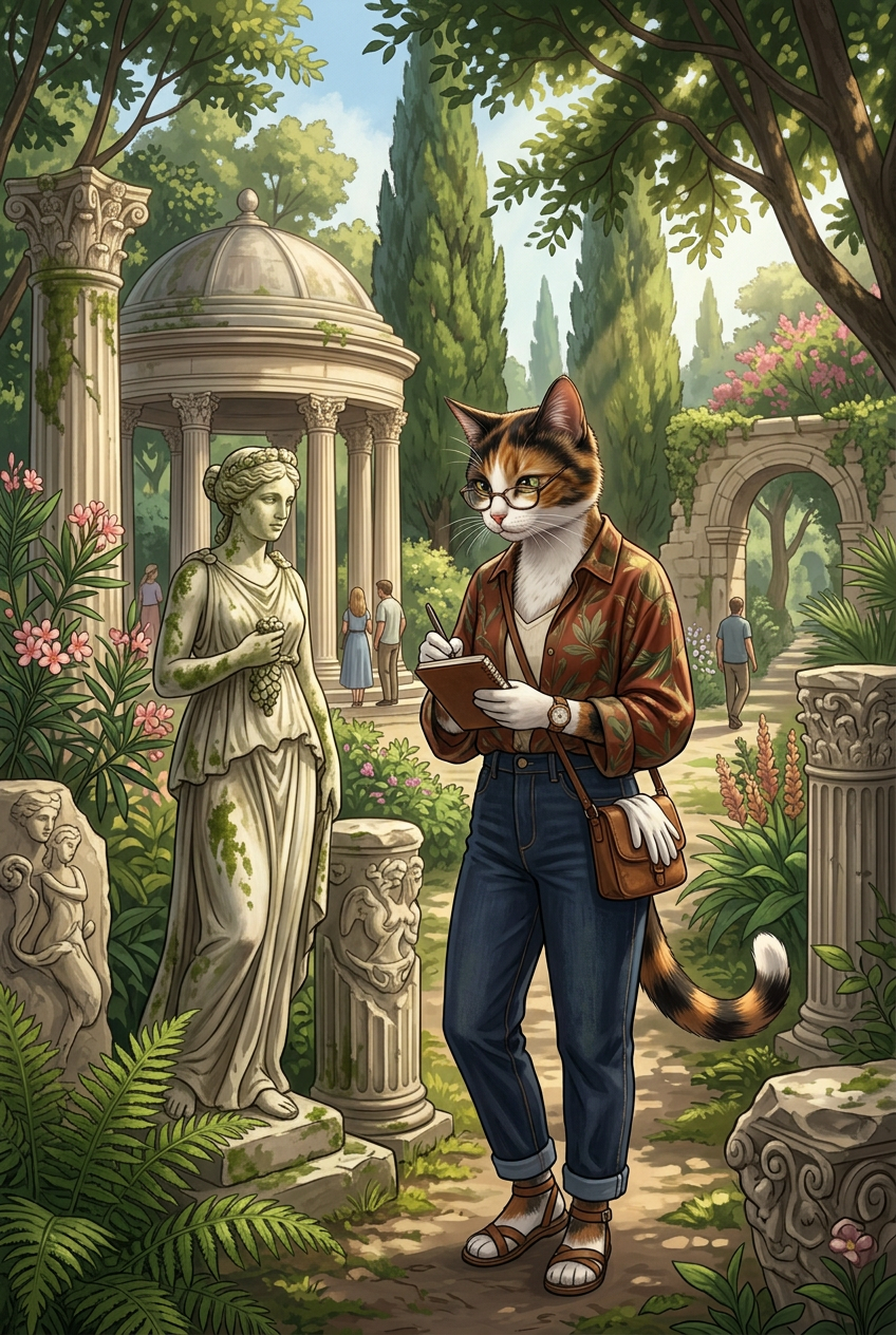 Anthropomorphic calico cat museum curator in a casual weekend outfit, exploring a lush botanical garden with ancient Roman statues and classical architecture, sunlight filtering through trees, natural and relaxed museum enthusiast aesthetic